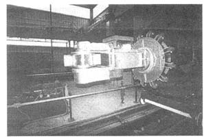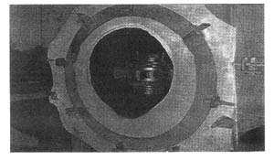 (3)磨料回收系統(tǒng) 主要作用是回收拋射過的磨料。通常由下面幾部分構(gòu)成,在導(dǎo)軌架下接收磨料;袋式提升機(jī);磨料過濾分離器;磨料漏斗和帶平臺的供料裝置;供料調(diào)節(jié)閥;布袋除塵器和引風(fēng)系統(tǒng)。圖4-2是內(nèi)拋頭的照片。圖4—3是內(nèi)拋丸除銹機(jī)的端部照片。