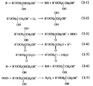 固化環氧樹脂的熱降解被認為是由自由基鏈式反應引起的。固化環氧樹脂主要的分子結構由R′OCH2CH(OH)CH2OR″表示,在這個結構中,具有活性的氫原子連接到叔碳原于上,這種活潑氫原子很容易被(R′)自由基拉過去,同時產生新的自由基(見式3-1)。這些自由基與氧反應生成了過氧化物自由基(式3-2)。這些過氧化物自由基瞬間分解成酮類,同時產生了過氧化氫自由基(式3-3)。酮化合物中的醚健斷裂而形成的自由基再分解成為更小分子量的產物,如甲醛以及通過多級分裂反應形成的其他醛類(式3-4和式3-5)。由這些分解反應產生的自由基團,如R'和HOO'又與固化環氧樹脂發生化學反應生成新的自由基(式3-6和式3-7),這些新的自由基又按照式(3-2)和式(3-5)所示的同樣方式分解。