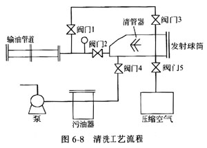 b.分段通清管器 自然段落長度L=15 km,高程H<30 m為準,通清管器以壓縮空氣為動力,跟蹤監視。清洗工藝流程如圖6-8所示。