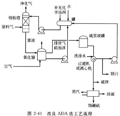 這類方法已在克勞斯裝置尾氣、低含硫氣井、焦?fàn)t氣、水煤氣、合成氣等氣體中廣泛應(yīng)用。以下以改良蒽醌二磺酸鈉法(改良ADA法)為例說(shuō)明其工藝流程(圖2-40)。