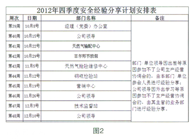安全經(jīng)驗(yàn)分享活動(dòng)的持續(xù)開展,內(nèi)容的通俗、分享的形式引起員工的共鳴,活動(dòng)得到了大家的認(rèn)可,同時(shí)表達(dá)出分享的愿望。因此,公司安全部門制定《XX季度安全經(jīng)驗(yàn)分享計(jì)劃安排表》,按照分享計(jì)劃,以每周生產(chǎn)協(xié)調(diào)例會(huì)為平臺,公司領(lǐng)導(dǎo)、各部門、單位收集業(yè)務(wù)范圍內(nèi)的HSE素材,主動(dòng)開展安全經(jīng)驗(yàn)分享。(見圖2)