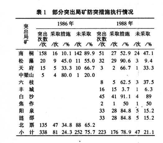 由表1看出,1986年有75.7%的突出是在未采取防突措施的情況下發生的,這基本上反映了我國多年來防突措施的執行情況。盡管在我國《煤礦安全規程》中規定了在突出危險煤層中進行采掘工作要采取防治突出措施,但由于采用防突局部措施要消耗大量人力和物力,故許多突出礦井往往只采取安全保護措施。1987年后,由于各級安全領導部門嚴格要求,并在各次防突出會議上強調要采用防突技術措施,故不執行措施的情況大有好轉。1988年未采取措施發生突出由1986年的75.7%下降為21.1%。但從表1看出,有78.9%的突出是在采取防突措施情況下發生的,這表明我國防突措施的效果亟待提高。