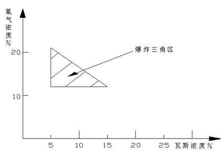瓦斯爆炸必須同時具備3個條件:一是火源(火花的能量達到0.28毫焦,溫度在400℃~500℃以上);二是氧氣(氧氣含量在12%以上);三是瓦斯本身的濃度在5%~15%范圍內。當瓦斯濃度低于5%,無論如何都不會發生瓦斯爆炸;當空氣中瓦斯濃度超過15%時,瓦斯也不再爆炸,而只是燃燒(在氧氣充足的情況下);當空氣中的氧氣濃度低于12%時,不管瓦斯濃度如何,都不會爆炸也不會燃燒。人員在高濃度瓦斯的環境中也會引起窒息死亡。瓦斯爆炸和燃燒跟氧氣濃度的關系如下圖所示。