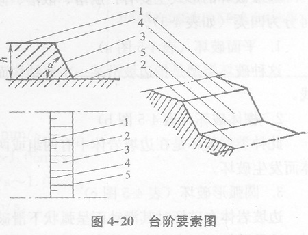 臺階上部水平面稱為臺階上郡平盤(圖4—20中的1);臺階下部水平面稱為臺階下部平盤(圖4—20中的2);上、下平盤之間已采掘。暴露部分的傾斜面稱為臺階坡面(圖4—20中的3);臺階坡面與下部平盤的夾角稱為臺階坡面角(圖4—20中的a);上、下兩平盤之間的垂直距離稱為臺階高度(圖4—20中的h);上部平盤與臺階坡面的交線稱為臺階坡頂線(圖4—20的4);下部平盤與臺階坡面的交線為臺階坡底線(圖4—20中的5)。