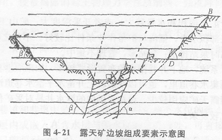 最終邊坡坡面:最終邊坡最上部一個臺階的坡頂線和最下部一個非工作臺階的坡底線所做的假想斜面。如圖4—21中的AC與BD兩個斜面。