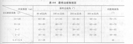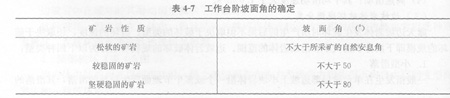 臺階坡面角一般分為工作臺階坡面角和最終臺階坡面角。工作臺階坡面角應符合表4—7規定。
