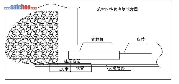 在具體開采過程中,注氮量要隨工作面漏風量及采空區“三帶”監測數據及時調整,每班供氮量不得小于6000m3,濃度不得低于97%的氮氣,以達到注氮惰化指標為準。注氮方式:在下隅角敷設20米φ108mm的地質鉆桿,并將地質鉆桿與支架連接,確保在支架移動時,地質鉆桿隨支架的移動進行移動,采用隨采隨注的方法進行注氮。注氮方式見示意圖。