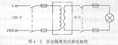(1)安全隔離變壓器或與其等效的具有多個(gè)隔離繞組的電動(dòng)發(fā)電機(jī)組,其繞組的絕緣至少相當(dāng)于雙重絕緣或加強(qiáng)絕緣。安全隔離變壓器的電路圖如圖4—2所示。
