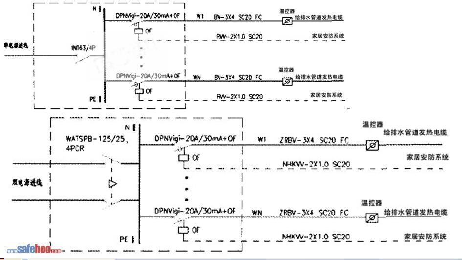發(fā)熱電纜在自身的產(chǎn)品設計中有較好的安全防護措施,包括雙重絕緣、高堅固性PvC護套等,但應用在住宅中,特別是應用在與各家各戶相連的管道系統(tǒng)中,就應該做到萬無一失,考慮到發(fā)生意外的可能,在設計發(fā)熱電纜的配電系統(tǒng)時,增加漏電保護裝置是必要的。
