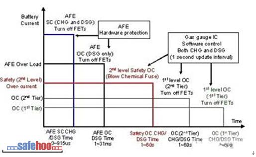 ?? 具有不同激活時間的多極過電流保護限(如圖2所示)使得電池包保護更為強健。電量計具有兩層的充電/放電過電流保護設定,而AFE則提供了第三層的放電過電流保護。在短路狀態下,MOSFET及電池可能在數秒內毀壞,電量計芯片集完全依靠AFE來自動的關斷MOSFET,以免產生毀壞。