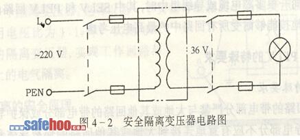 (1) 安全隔離變壓器或與其等效的具有多個隔離繞組的電動發電機組,其繞組的絕緣至少相當于雙重絕緣或加強絕緣。安全隔離變壓器的電路圖如圖4-2所示。