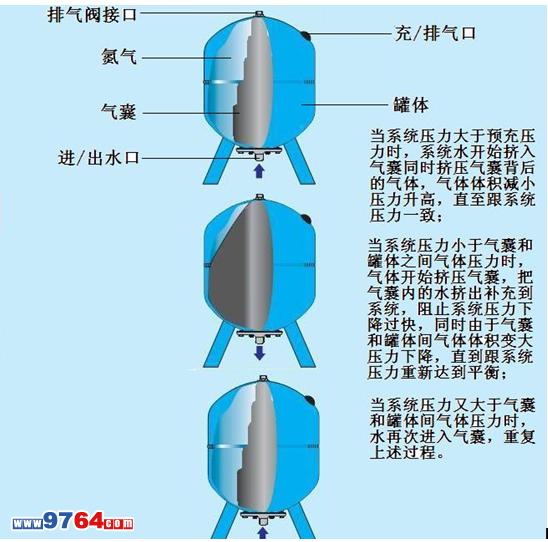 有上面其結構可知:當膨脹罐用于系統中時,由于系統壓力比預充氣體的壓力,所以會有一部分工作介質進入氣囊內(對隔膜式來講是進入罐體內),直到達到新的平衡,當系統壓力再度升高,系統壓力再次大于預充氣體的壓力,又會有一部分介質進入囊內,壓縮囊和罐體間的氣體,氣體被壓縮壓力升高,當升高到跟系統壓力一致時,介質停止進入,反之,當系統壓力下降,系統內介質壓力低于囊和罐體間的氣體壓力,氣囊內的水會被氣體擠出補充到系統內,使系統壓力升高,直到系統工作介質壓力跟囊和罐體間的氣體壓力相等,囊內的水不再外系統補給,維持動態的平衡。