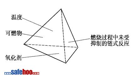 對有焰燃燒,根據燃燒的鏈鎖反應理論,因燃燒過程中存在未受抑制的游離基(自由基)作中間體,考慮游離基參加燃燒反應的附加維,從而形成著火四面體,如圖1-1-2。自由基是一種高度活潑的化學基團,能與其他的自由基和分子起反應,從而使燃燒按鏈式反應的形式擴展。因此,有焰燃燒的發生需要未受抑制的鏈式反應。