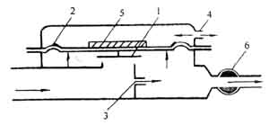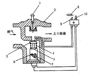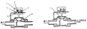 如果流向燃燒裝置的燃氣壓力不足,容易發生火焰熄滅,使未燃氣體積聚而形成爆炸混合物。因此,需要安裝預防燃氣不足的安全器,其構造如圖3—10—16所示。當燃氣量不足而壓力下降時,靠重塊力量使閥芯1下降,關閉燃氣通路。關閉安全器后面的旋塞,通過小孔3燃氣流入閥后,薄膜下壓力升高而將安全器重新打開。當燃氣流量足夠時,再打開閥后旋塞。通過小孔3流出的燃氣量極少,不致引起危險。如果旋塞6不關閉,閥芯I就不會開啟。
