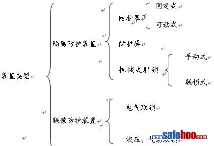 (1) 按安全裝置的使用功能可分為兩大類:安全保護裝置和安全控制裝置。安全保護裝置是指配在機械設備上能防止危險部位及危險因素引起傷害,保障人身和設備安全的所有安全裝置。當操作者處于危險區域或設備處于不安全狀態時,安全保護裝置能直接起安全保護作用,如隔離防護安全裝置、聯鎖防護安全、超限保險安全裝置、緊急制動裝置等。安全控制裝置本身并不直接參與人身保護動作,根據其作用方式不同分為安全防護控制裝置和安全監測控制裝置,具體如下: