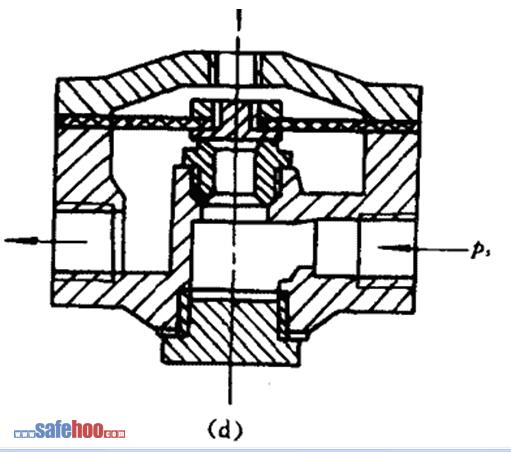 圖b和c分別為球閥式和膜片式安全閥,工作原理與活塞式完全相同。這三種安全閥都是彈簧提供控制力,調節彈簧預緊力,即可改變安全值大小,故稱之為直動式安全閥。