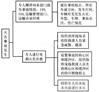 電石道路運輸緊急救援預案包括運輸單位運輸車輛情況及主要的運輸產品、運量、運地、行車路線等基本內容,同時還應包括事故發生后應采取的處理措施、危險區的隔離、事故可能擴大后的應急措施。火災事故救援預案如下圖所示。