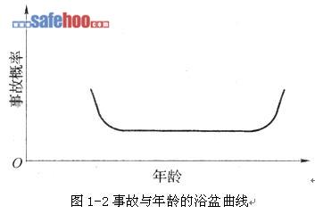 ??? ③生理素質。生理素質是指影響安全生產的人體生命活動,包括身體條件及生理狀況。主要有年齡、性別、記憶力、體力、耐力、血型、視力、視覺、聽覺、動作反應時間和疲勞強度等。比如司機年齡與行車事故之間構成的浴盆曲線(圖1-2),出現這種曲線的主要原因在于青年人缺乏必要的工作經驗和對自身的控制能力,冒險性強,容易受外界干擾,故易發生事故;而年長者由于生理機能不斷衰退,體力減退,力不從心,也易發生事故。