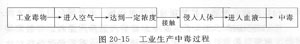 不管是哪一種毒物,均是以一定的形式或狀態(tài)存在于二正業(yè)生產(chǎn)過程之中,不過以固態(tài)或液態(tài)存在時,造成中毒可能性少一些,而以粉塵、蒸氣、煙、霧、氣溶膠或氣態(tài)形式存在時更加危險一些,因為這些形式可以擴散在空氣之中,由呼吸道進人人體。但是,不管工業(yè)毒物以哪種形式存在或其毒性是多么強烈,要危及勞動者其先決條件是必須接觸勞動者的機體。當接觸到勞動者之后,工業(yè)毒物才得以按照各自的特性通過侵入途徑進入體內(nèi)。不管工業(yè)毒物侵入從哪一條途徑,首先是要進入血液之中,然后再由血液帶到全身,在適宜的部位產(chǎn)生作用。當毒物的數(shù)量積蓄到一定程度時,于是出現(xiàn)了中毒的癥狀。這便是在工業(yè)生產(chǎn)過程中,發(fā)生中毒事故的全過程。如圖20—15所示。