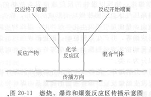 (2)燃燒、爆炸和爆轟? 發(fā)生在爆炸物質(zhì)內(nèi)的燃燒、爆炸和爆轟,有它們的共同點(diǎn)和不同點(diǎn)。它們的共同點(diǎn)在于:燃燒、爆炸和爆轟都是以化學(xué)反應(yīng)的形式進(jìn)行的。燃燒、爆炸和爆轟一經(jīng)發(fā)生,它們不是在全體爆炸物內(nèi)進(jìn)行,而是在某一局部區(qū)域進(jìn)行化學(xué)反應(yīng),這個(gè)化學(xué)反應(yīng)區(qū)域按一定的方向,一定的速度,一層層地自動(dòng)傳播進(jìn)行。化學(xué)反應(yīng)區(qū)很窄,反應(yīng)就在這個(gè)區(qū)域內(nèi)完成,而且這個(gè)過(guò)程一經(jīng)發(fā)生就可以自動(dòng)地繼續(xù)下去,直到爆炸物質(zhì)全部反應(yīng)完畢。參見(jiàn)圖20—11所示。