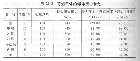 ①爆炸的溫度和壓力? 爆炸的溫度和壓力是衡量爆炸過程放出能量多少的兩個(gè)重要參數(shù)。各種爆炸性混合物在正常條件下的爆炸壓力大多不超過1000 kPa,溫度大多不超過3000℃,但爆炸后的壓力上升速度相差卻很大,各種可燃?xì)怏w的爆炸壓力和壓力上升速度如表20—2。