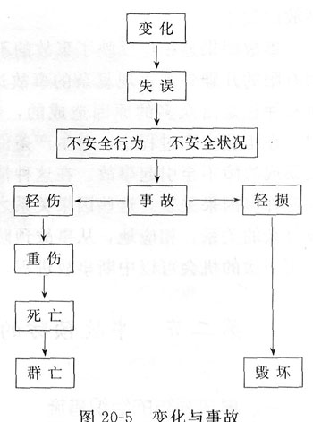工業生產過程中的諸因素在不停地變化。針對這些變化,我們的工作要隨時與之相適應,否則,將發生管理失誤或操作失誤,最終導致事故或損壞。如圖20—5所示。