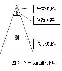 比例1:29:300表明了事故發(fā)生頻率與傷害嚴(yán)重程度之間的普遍規(guī)律,即嚴(yán)重傷害的情況是很少的,而輕微傷害及無傷害的情況是大量的。應(yīng)該注意的是,事故是一種意外事件,本身并無輕重之分,只能說事故的結(jié)果為無傷害、輕微傷害或嚴(yán)重傷害。