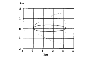 ??? 氯氣在空氣中的允許濃度為25ppm,以此為標準,液氯泄漏后在下風向地面的濃度分布見圖1所示。圖1中陰影部分表示氯氣濃度大于25ppm。由圖1可見,液氯的最大影響距離也達到300m。由于模擬過程中假設泄漏工廠周圍地勢平坦,因此由模擬結果得出的氯氣影響范圍偏大,但這對于指導今后的緊急泄漏事故應急處理方案是有益的。在此次液氯泄漏事故處理中,應急救援中心將應急程度定為3級(最高級),從模擬結果來看是合理的,因為下風向1000m處的城鎮已經全部處于氯氣云團的籠罩之下。圖1中陰影部分外圍的虛線表示氯氣云團有可能影響到的區域,它主要是受風向改變的影響。