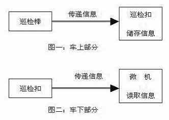 客車巡檢系統由硬件部分和軟件部分構成,硬件部分由巡檢棒和巡檢扣組成,每個乘務組一套,巡檢扣分別安裝于行李車工具室、餐車配電室、發電車冷卻室(或尾車配電室),每小時巡視一次,由巡檢棒向巡檢扣傳輸信息一次,以傳輸信息來達到巡視目的。下車后將巡檢扣交車間讀取信息。軟件部分由信息讀取器和軟件組成,信息讀取器讀取巡檢扣儲存的信息。(見下圖)
