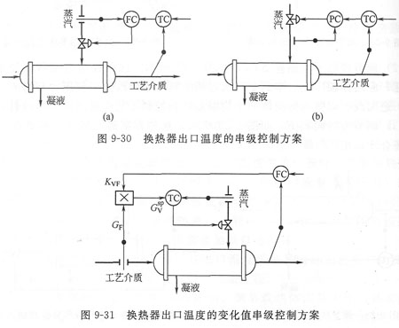 大多數(shù)情況下,當(dāng)工藝介質(zhì)較穩(wěn)定時(shí),采用單回路控制就能滿足要求。若還滿足不了工藝要求,則可以從方案著手,引入復(fù)雜控制系統(tǒng),如串級(jí)、前饋等。以圖9—26所示的蒸汽加熱系統(tǒng)為例,當(dāng)蒸汽閥前壓力波動(dòng)較大時(shí),可采用工藝介質(zhì)出口溫度與蒸汽流量或蒸汽壓力組成的串級(jí)控制系統(tǒng),如圖9—30所示。而當(dāng)主要擾動(dòng)是生產(chǎn)負(fù)荷變化時(shí),引入前饋信號(hào)組成前饋—反饋控制系統(tǒng)是一種行之有效的方案,可獲得更好的控制品質(zhì)。圖9—31以變比值串級(jí)控制方式引入了工藝介質(zhì)流量的前饋信息,前饋?zhàn)饔每纱蟠鬁p少生產(chǎn)負(fù)荷變化對(duì)出口溫度控制質(zhì)量的影響。