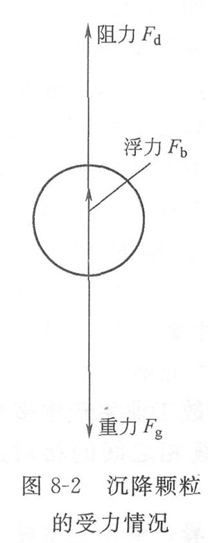 將直徑為d,密度為ρs的光滑球形顆粒置于密度為ρ的靜止流體中,由于所受重力的差異,顆粒將在流體中降落。如圖8—2所示,在垂直方向上,顆粒將受到3個力的作用,即向下的重力Fs,向上的浮力幾和與顆粒運動方向相反的阻力幾。