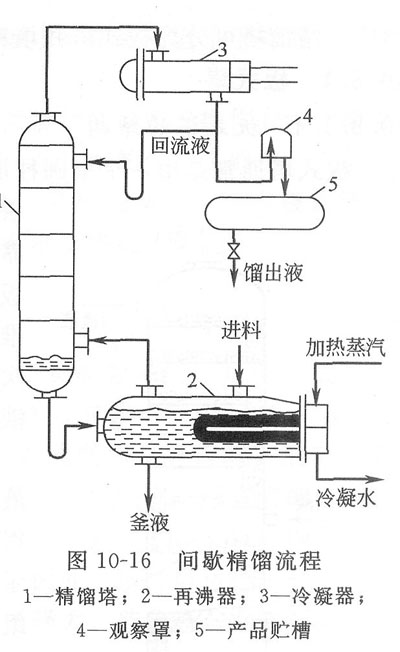 間歇精餾又稱分批精餾,是把原料一次性加入蒸餾釜內(nèi),在操作過程中不再加料,如圖lo—16所示。將釜內(nèi)的液體加熱至沸騰,所產(chǎn)生的蒸汽經(jīng)過各塊塔板到達塔頂外的完全冷凝器。剛開始時,將冷凝液全部回流進塔,于是,塔板上可建立泡沫層,各塔板可正常操作,這階段屬開工全回流階段。在全回流操作穩(wěn)定后,逐漸改為部分回流操作,可從塔頂采集產(chǎn)品,塔頂產(chǎn)品中易揮發(fā)組分的濃度高于釜液濃度。隨著精餾過程的進行,釜液濃度逐漸降低,各層塔板的氣、液相濃度亦逐漸降低。可見,間歇精餾操作的特點是分批操作,過程非定態(tài),只有精餾段,沒有提餾段。間歇精餾因在塔頂有液體回流,有多層塔板,故屬精餾,而不是簡單蒸餾。間歇精餾雖操作過程非定態(tài),但各固定位置的氣、液濃度變化是連續(xù)而緩慢的。