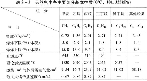 天然氣中含量最多的成分是甲烷,我國各油氣田商品天然氣中甲烷的含量一般為85%~98%,甲烷是比空氣稍輕的無色可燃氣體,在20℃、標準大氣壓下,1m3甲烷的凈熱值:是32926kJ/m3。天然氣屬易燃、易爆物質,在通常環境中極易引起燃燒和爆炸。當天然氣和空氣中的氧氣混合濃度達到一定的數值(稱為爆炸下限)后,遇明火就會發生爆炸。天然氣中各主要組分基本性質見表2-1。