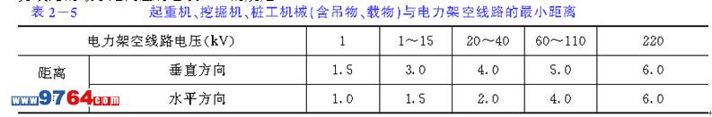 (9) 嚴禁在架空線路下方進行機械鉆孔。在電力架空線路附近作業時,機械邊緣與電力線路的最小距離應符合表2-5的規定。