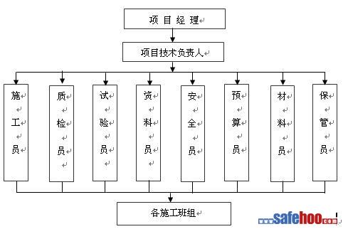 本工程管理架構(gòu)在項(xiàng)目部管理架構(gòu)中增加了專業(yè)管理人員,本工程實(shí)施項(xiàng)目法施工。項(xiàng)目部全面組織、全權(quán)指揮工程施工,對工程進(jìn)度、質(zhì)量、成本、安全、文明施工等負(fù)全面責(zé)任。項(xiàng)目部內(nèi)實(shí)行層級管理,定人、定崗、定職責(zé),分工明確,責(zé)任到人。