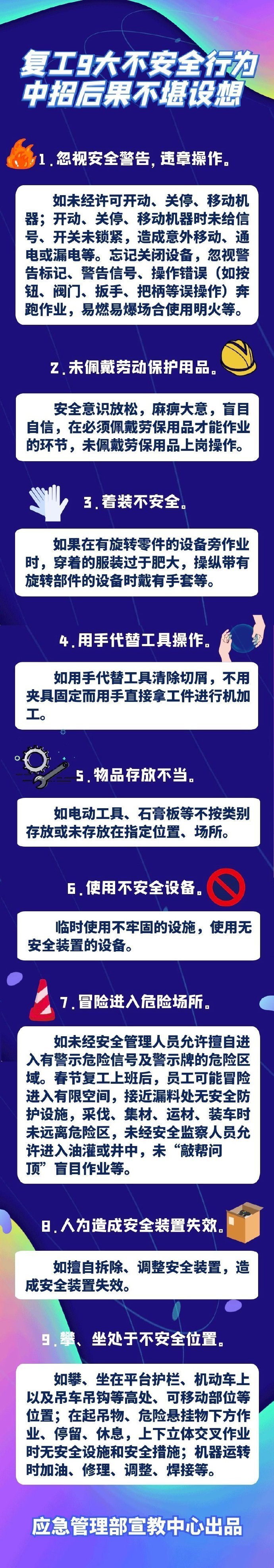 節后復工,生產安全需要引起格外重視。要杜絕忽視安全警告、違章操作、不按規定佩戴勞動保護用品、冒險進入危險場所等不安全行為,一旦發生后果不堪設想。