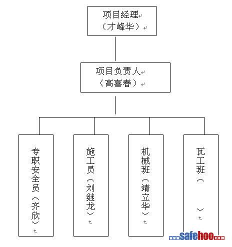 項目經理為本工程施工的安全第一責任人,項目負責人為安全工作第一控制人,以下由專職安全員和班組兼職安全員形成本項目三級安全管理網絡。從上到下一級控制一級,從下到上一級向一級保證,明確各級安全職責,切實把安全管理工作落實到實處。