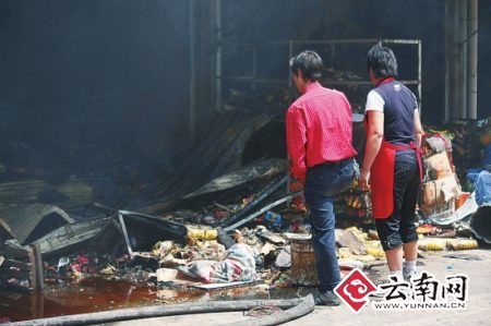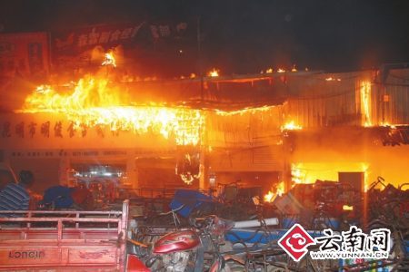 22日凌晨2點30分左右,昆明南二環路外孫家地永豐食品批發市場內一排9字標號的商鋪突發火災,昆明消防啟動了一級全勤指揮,2點50分左右,第一輛消防車趕到現場,總計6個中隊17輛消防車以及110多名消防隊員趕赴火場參與救援。但是由于失火房屋是木板外裹鐵皮結構,火勢迅速蔓延,最終,共有18家商鋪不同程度被燒,其中大部分鋪面被燒得黑乎乎一片,什么也沒有剩下。萬幸的是,如此嚴重的火災沒有造成任何人員傷亡。