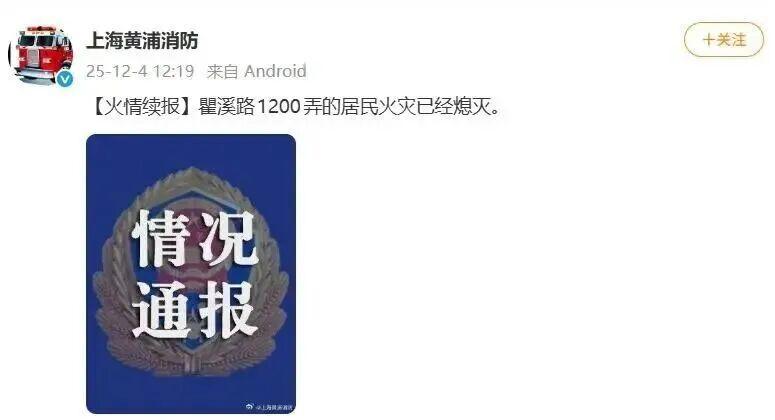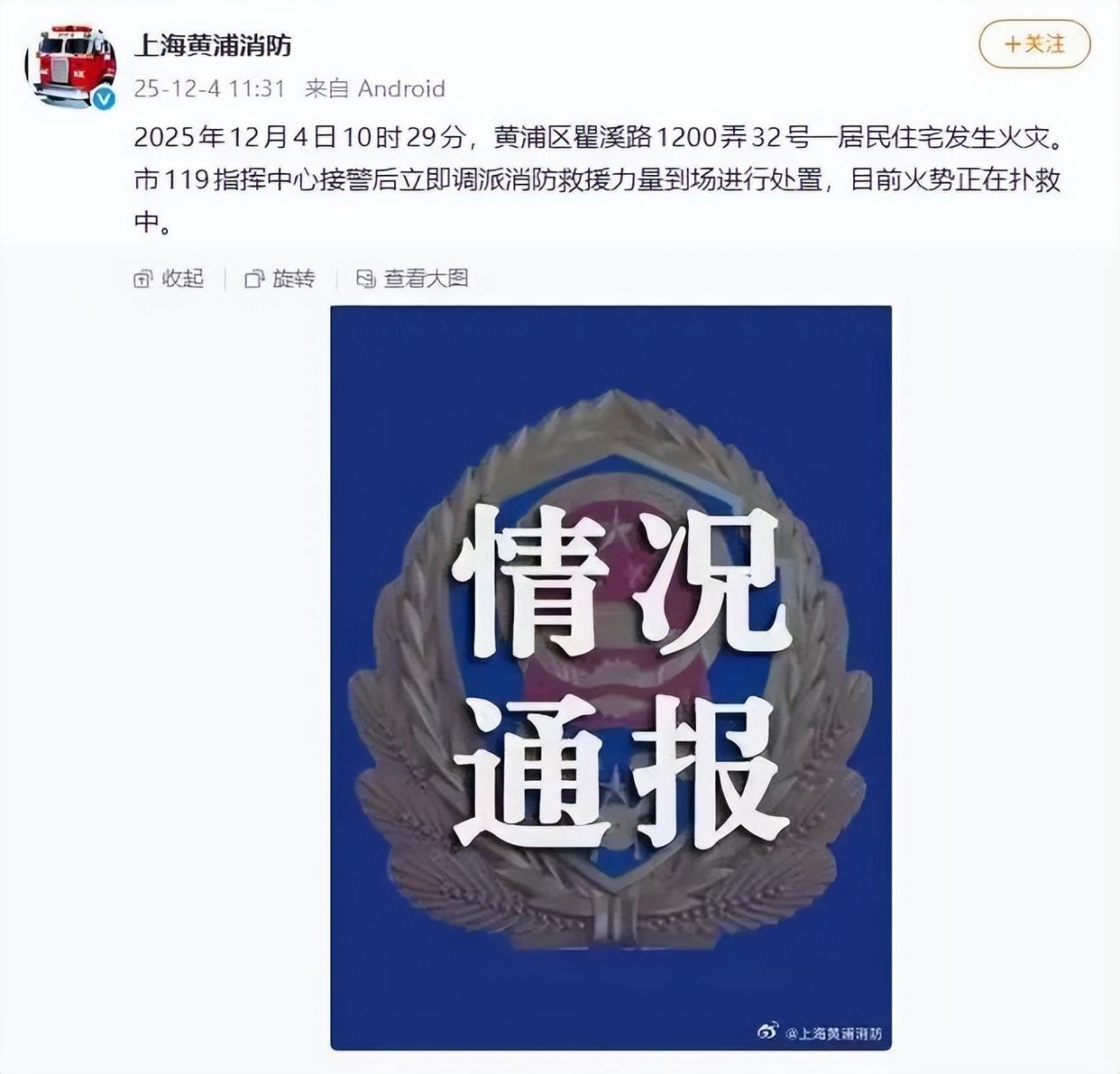 據@上海黃浦消防 11:31官方通報:2025年12月4日10時29分,黃浦區瞿溪路1200弄32號一居民住宅發生火災。市119指揮中心接警后立即調派消防救援力量到場進行處置,目前火勢正在撲救中。
