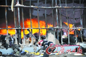 當(dāng)天早上,新華社記者來到距離著火商廈20米處時,就能明顯感到一股股熱浪迎面撲來,跟隨消防人員進(jìn)入商廈,視野所及,一片濃煙和火光,商鋪里的貨物仍在燃燒。十多輛消防車目前仍在商廈外交替向著火的商廈頂部噴水,大批消防員拉著水龍在商廈內(nèi)撲火。