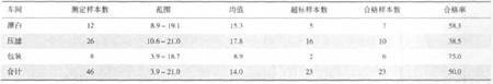 對調查的3間企業作業場所共采樣46份空氣樣品,進行了SO2測定,結果:高于國家衛生標準(15 mg/m3)的有23份樣品;其中漂白車間測定12份樣,合格7份樣,合格率58.3%;壓濾車間測定26份樣,合格10份樣,合格率38.5%;包裝車間測定8份樣,合格6份樣,合格率75.0%,見表1。