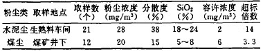 ??? 2. 1 粉塵測試結(jié)果由表1可見,水泥粉塵濃度、分散度高于煤塵;游離Si02含量也高于煤塵。水泥粉塵超標(biāo)14倍,煤塵超標(biāo)3. 3倍。
