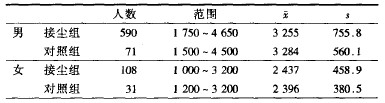 ??? 2.2.3肺活量測(cè)定見表4。從肺活量測(cè)定結(jié)果看,接塵組與對(duì)照組無(wú)差別,也就是說(shuō)未見粉塵影響肺活量。文獻(xiàn)報(bào)道肺組織代償功能很強(qiáng),損害程度不嚴(yán)重時(shí),臨床上表現(xiàn)不出來(lái),因而未見肺活量改變,這與文獻(xiàn)報(bào)道是一致的。