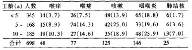 ??? 2.2.2癥狀體征與工種關(guān)系 見表3。各工種的粉塵作業(yè)工人所發(fā)生的癥狀和體征差異無(wú)顯著性,但發(fā)生喉癢、喉痛癥狀的工人中,<5 a工齡的與10 a一工齡組比較,差異有非常顯著性(P<0.01),在接塵工人中,5a一工齡組比<5a工齡組發(fā)生咳嗽癥狀和患肺結(jié)核的患病率高,差異非常顯著(P<0.01),其余體征各工齡組之間,差異無(wú)顯著性(P>0.05),提示粉塵對(duì)人體的影響有個(gè)作用過(guò)程,工齡長(zhǎng)短是一個(gè)影響因素。