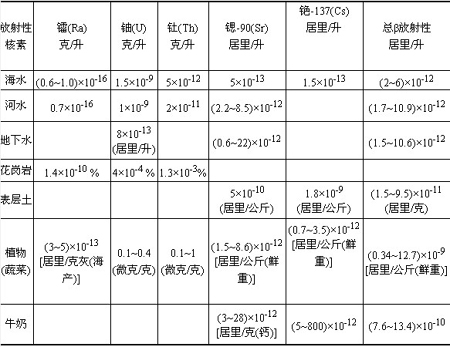 自然界中的放射性物質(包括人工生產的),轉移到人體內使每個人體組織中都帶有一定數量的放射性物質。有人曾對20多個國家和地區的一千多個人骨樣中的鐳含量進行了測量,結果顯示:一般地區鐳含量的平均值為(4-39)×10-15居里[(1.5-14.4)×10-4貝可]/克(骨灰),高本底地區的平均值為(143-1340)×10-15居里[(53-596)×10-4貝可]/克(骨灰)。