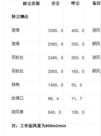 煤礦粉塵的80%產自采掘工作面,在無防塵措施條件下,炮采的粉塵濃度為300~500mg/m3,綜采、綜放工作面粉塵濃度最高達到 2500~3000???? mg/m3,表1為某工作面在未采用防塵措施的情況下測得的各測塵點的粉塵濃度,表2為在防塵措施使用基本正常情況下測得的各測點的粉塵濃度。
