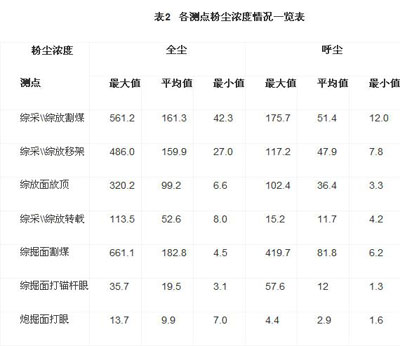 我國(guó)工業(yè)企業(yè)設(shè)計(jì)衛(wèi)生標(biāo)準(zhǔn)所規(guī)定的居民區(qū)大氣中飄塵日平均最高允許濃度為0.15mg/m3,煤礦安全規(guī)程中對(duì)井下有人工作的地點(diǎn)和人行道的空氣中粉塵(總粉塵、呼吸性粉塵)濃度,要符合表2中的要求。