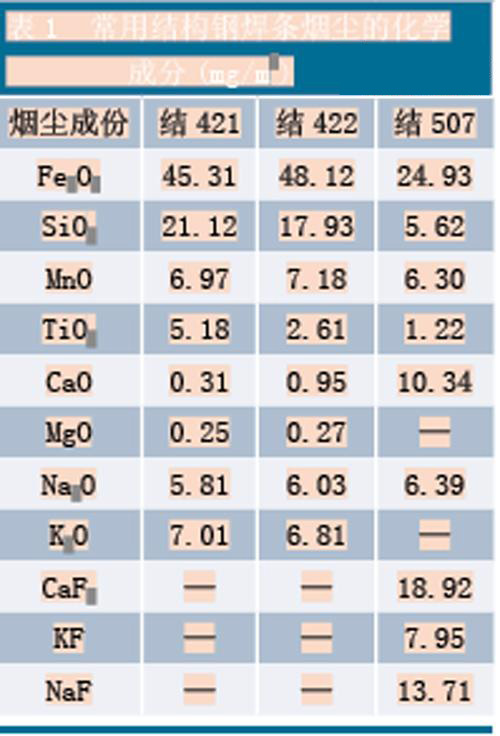 焊接煙塵是由金屬及非金屬物質在過熱條件下產生的蒸氣經氧化和冷凝而形成的。因此焊接煙塵的成分,取決于焊接材料(焊絲、焊條、焊劑等)和被焊接材料成分及其蒸發的難易。不同成分的焊接材料和被焊接材料,在施焊時將產生不同成分的煙塵(見表1)。