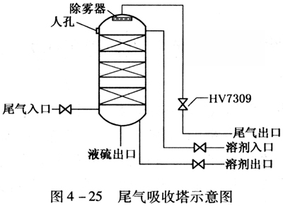 該公司硫磺回收裝置尾氣吸收塔示意圖見圖4-25,2002年9月5日此尾氣吸收塔停工檢修。退完塔內物料后,先水洗一次,再用SD-DF4型FeS鈍化劑由溶劑入口進入塔內進行鈍化處理,然后從溶劑出口出塔。鈍化處理完畢又進行一次水洗后,將塔頂人孔打開,準備自然通風后檢查塔頂情況。