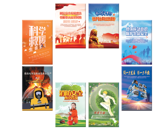 本套招貼體現了國家政策、以人為本、安全發展、應急管理、安全教育等多方面內容,緊扣2019 年全國安全生產月主題,畫面簡潔大方,富有沖擊力,既烘托氣氛又發人深思。適于各級政府和企業安全月期間進行宣傳展示。